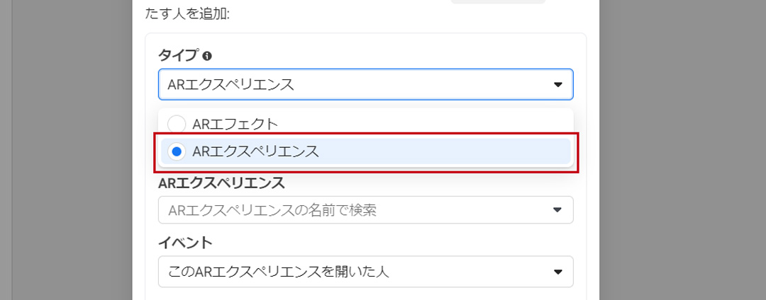 【タイプ】から「ARエクスペリエンス」を選択しましょう。ちなみにもう一方の選択肢である「ARエフェクト」は広告で使用されるエフェクトには入りません。