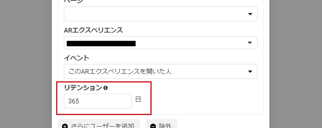 リテンションの日数を指定してください。設定可能な最大日数は365日で、最大に設定すると「以降にアクションを起こした人すべて」が対象になります。