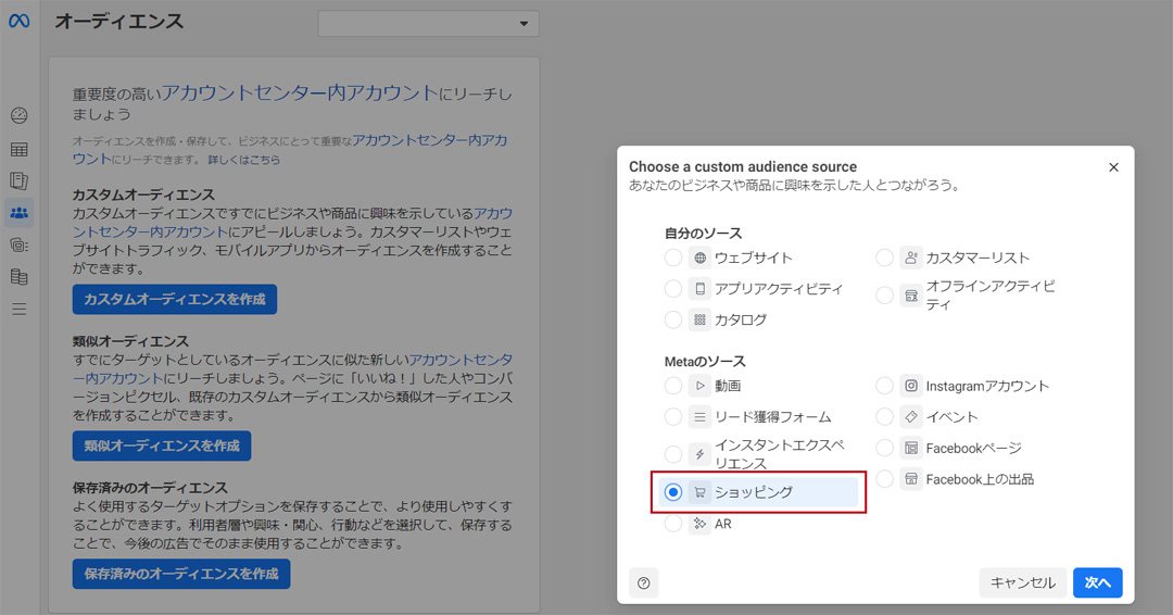 エンゲージメントの選択肢から「ショッピング」を選択します。