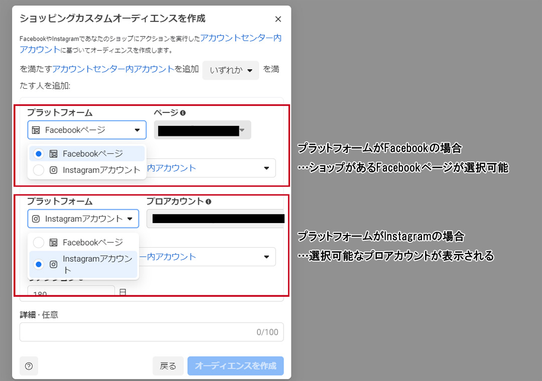 プラットフォームで「Facebookページ」を選択すると、ショップがあるFacebookページが選択可能です。