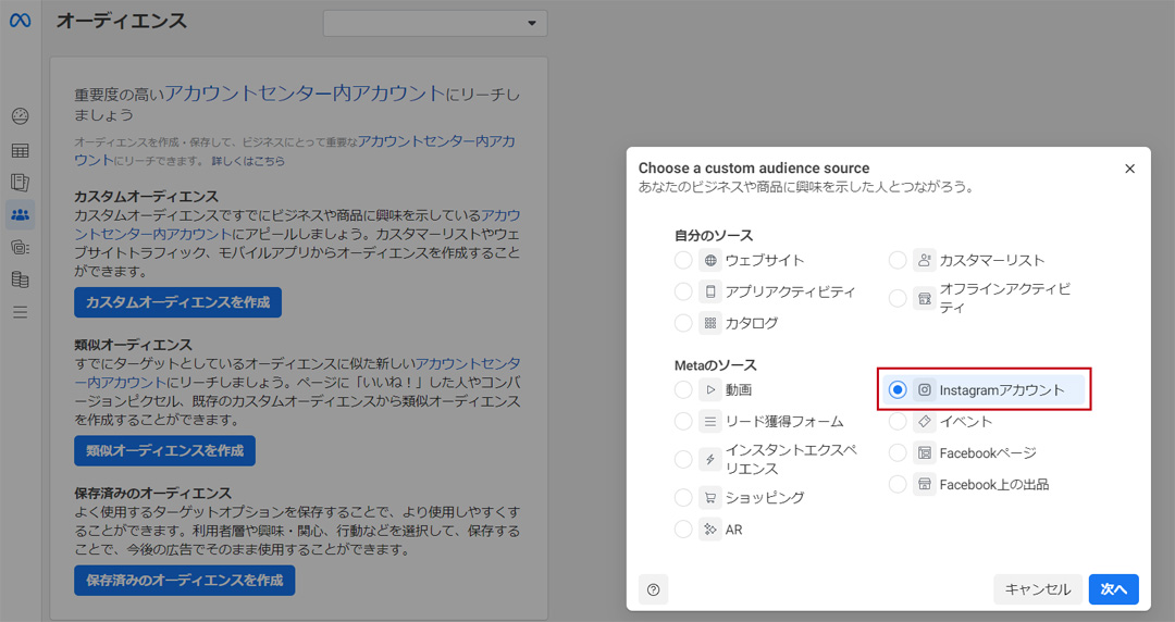 エンゲージメントの選択肢から「Instagramアカウント」を選択します。