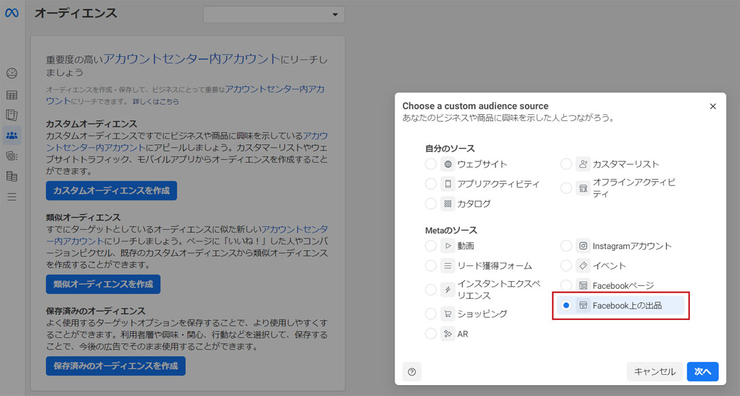 エンゲージメントの選択肢から「Facebook上での出品」を選択します。