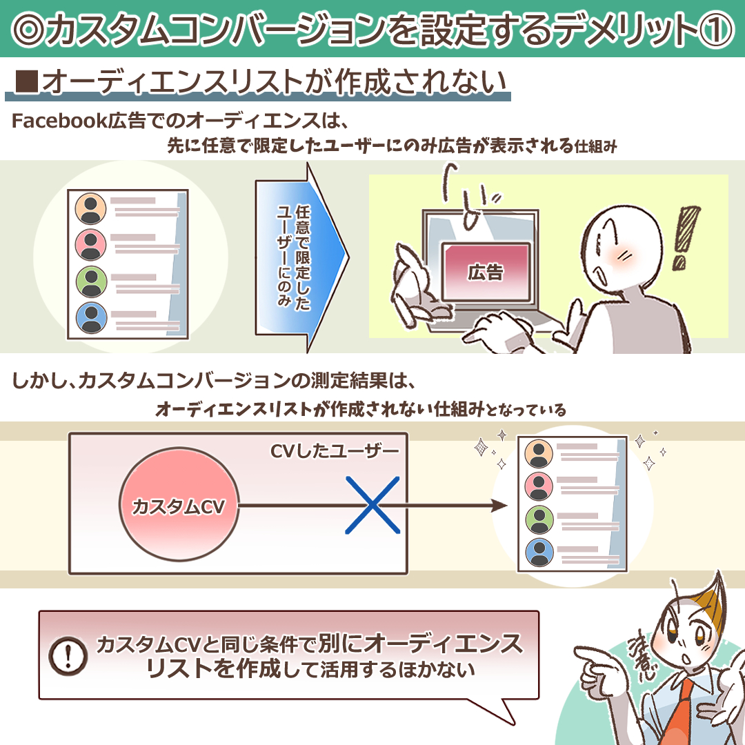 多くのメリットをもたらすカスタムコンバージョンですが、その仕様を正しく理解せずに利用すると、意図しない結果を招く可能性もあります。ここでは、設定時に特に留意すべき2つのデメリット(注意点)と、それらに対する具体的な対策について解説します。