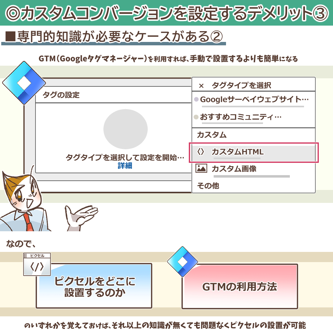 カスタムコンバージョンの大きなメリットとして「設定が簡単で、コードの専門知識が不要」という点を挙げました。これは、URLルールに基づいて設定する場合においては全くその通りです。しかし、この「簡単さ」を享受するためには、その大前提として**「Metaピクセルのベースコードがウェブサイトに正しく設置されていること」が絶対条件**となります。そして、このMetaピクセルの設置作業自体は、どうしても最低限のHTMLに関する知識を必要とします。ピクセルコードはMetaのイベントマネージャからコピーできますが、それをウェブサイトのどの部分(通常は全ページのHTMLソースコード内にある<head>タグ内)に貼り付けるのかを理解していなければなりません。この最初のハードルを越えなければ、カスタムコンバージョンを含むいかなるコンバージョン計測も開始することができません。とはいえ、このピクセル設置は一度正しく覚えてしまえば、決して難しい作業ではありません。WordPressなどのCMS(コンテンツ管理システム)を利用している場合は、専用のプラグインを使えばコードを直接編集することなく、指定の欄にピクセルIDを入力するだけで完了するケースも多いです。また、より高度で柔軟なタグ管理を行いたい場合は、GTM(Googleタグマネージャー)の利用が推奨されます。GTMを使えば、ウェブサイトのコードを直接触ることなく、様々な広告タグや計測タグを一元管理できます。GTMの利用方法を習得するには学習コストがかかりますが、一度覚えてしまえば、Metaピクセルだけでなく、Google広告やその他多くのサードパーティーツールのタグ設置も容易になり、マーケティング担当者の機動性は飛躍的に向上します。結論として、「カスタムコンバージョンは簡単」という言葉を鵜呑みにするのではなく、その前提となる**「ピクセルを正しく設置する、あるいはGTMを介して管理する」ための基本的な知識・スキルは、現代の広告運用担当者にとって必須**のものであると認識しておくことが重要です。