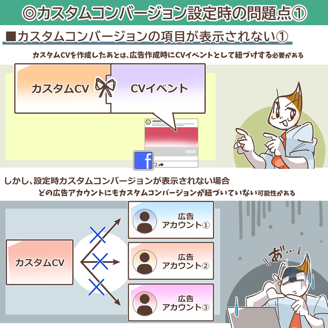 カスタムコンバージョンは非常に便利な機能ですが、設定や仕様の理解が不十分だと、意図通りに機能しないことがあります。ここでは、運用現場で頻繁に遭遇する可能性のある2つの典型的な問題点と、その具体的な解決策について詳しく解説します。