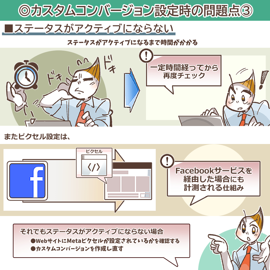 カスタムコンバージョンを作成すると、そのステータスはまず「データ受信なし」や「非アクティブ」と表示されます。このステータスは、設定したルールに合致するユーザー行動(イベント)が実際に発生し、Metaのサーバーで受信されて初めて「アクティブ」に変わります。しかし、設定後にしばらく待ってもステータスが変わらない場合、いくつかの原因が考えられます。最も単純な原因は、**純粋にまだ誰もその行動をとっていない**、というものです。特に、サイトへのトラフィックが少ない場合や、非常にニッチな条件でカスタムコンバージョンを設定した場合は、アクティブになるまで時間がかかることがあります。この場合、まずは自分でテストとしてその行動を意図的に起こしてみることが有効です。例えば、サンクスページのURLで設定したなら、そのURLに自分でアクセスしてみます。その際、Facebookにログインしているブラウザからアクセスすると、より確実にイベントがMetaに認識されます。それでもステータスがアクティブにならない場合は、より根本的な問題、すなわち**「Metaピクセルが正しく機能していない」**可能性を疑うべきです。ピクセルコードがサイトに正しく設置されているか、Chromeの拡張機能である「Meta Pixel Helper」などを使って確認しましょう。このツールは、表示しているページでピクセルが正常に発火しているか、エラーは発生していないかを簡単にチェックできます。ピクセル自体に問題がない場合は、カスタムコンバージョンの**「ルール設定のミス」**も考えられます。URLの文字列が間違っている(例:https://の有無、wwwの有無、最後のスラッシュ/の有無など)、パラメータの名称が間違っている、などが典型的な例です。ルールを再度見直し、コピー&ペーストで正確な値を設定し直すことをお勧めします。これらの手順を踏んでも解決しない場合は、一度そのカスタムコンバージョンを削除し、再度慎重に作成し直すのが最終的な手段となります。