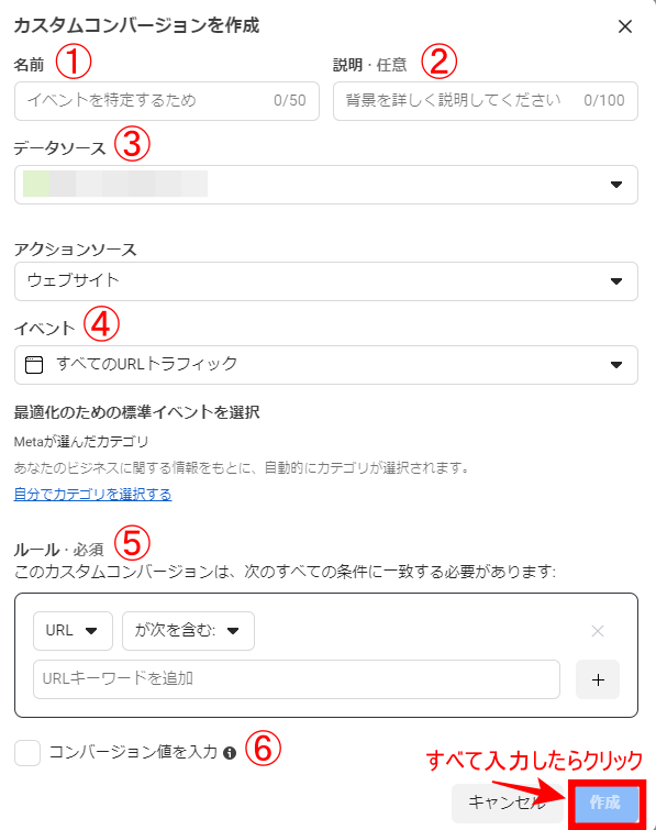 | データソース | 先に作成したMetaピクセルの中から、使用するピクセルを選択する |