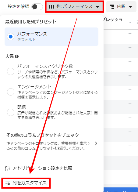 - 「列:パフォーマンス>列をカスタマイズ」をクリック