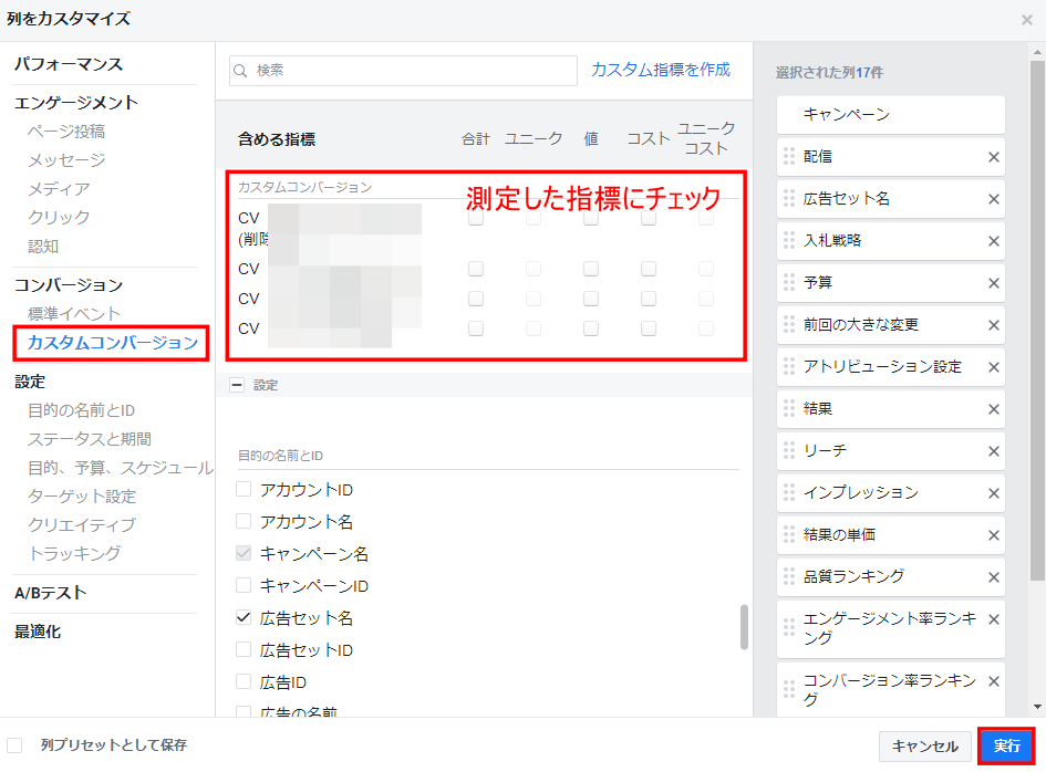 - 「カスタムコンバージョン」をクリックして表示されたカスタムコンバージョンから、計測したいものをチェックして「実行」をクリック