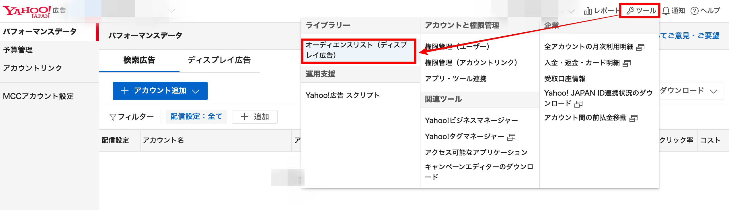 1.広告管理ツール右上にある「ツール」をクリックし、ライブラリーから「オーディエンスリスト」をクリック