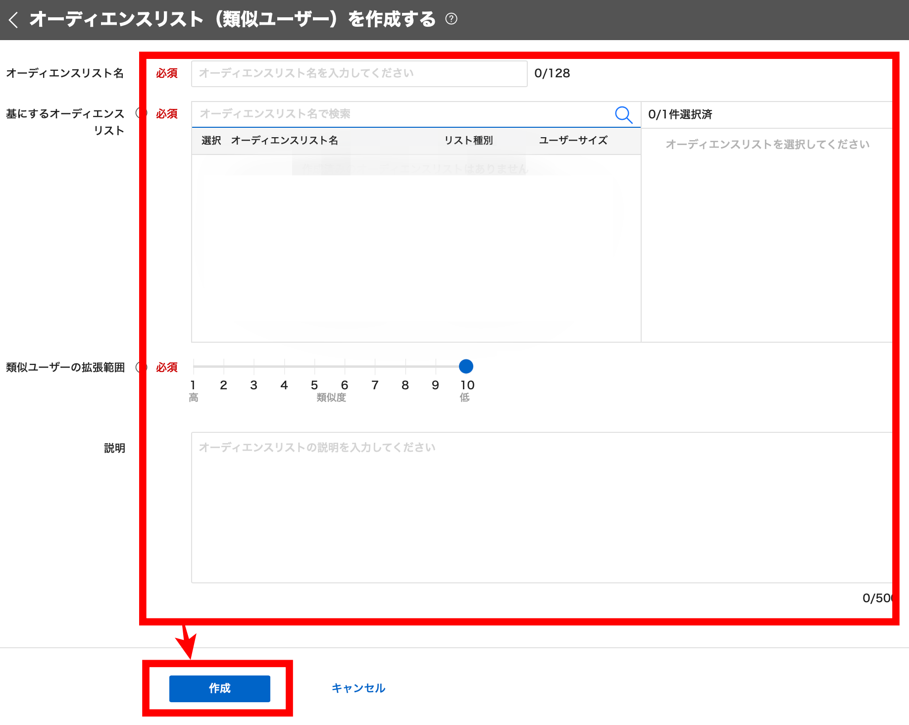 3.オーディエンスリスト名を任意で入力し、基となるオーディエンスリストを選択します。
