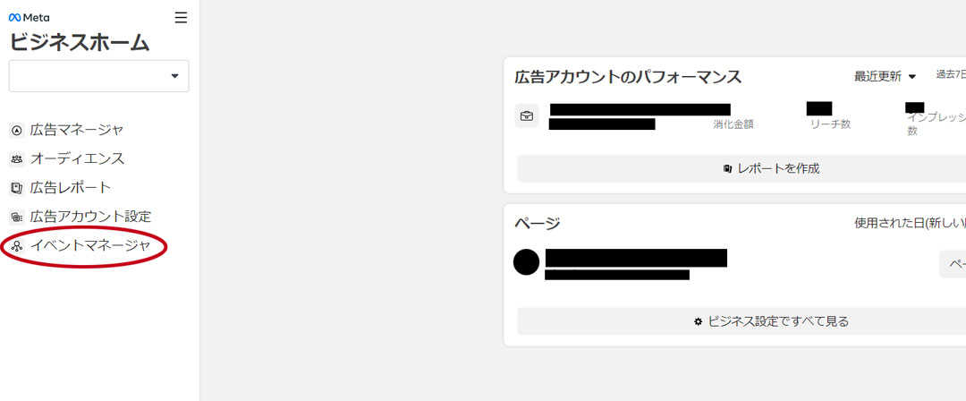 まずは、ホーム画面左側の「ビジネスマネージャ」をクリックして、ビジネスマネージャの画面に切り替えます。