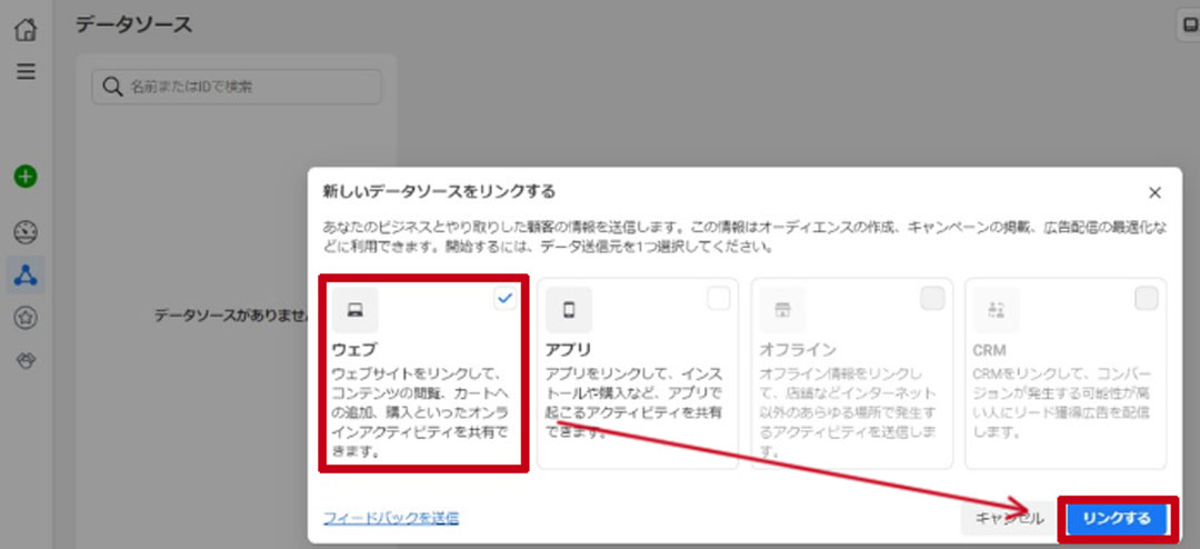 データソースをリンクをクリックすると、下の図のような画面が表示されるので、そこからwebサイトやアプリなどの「データ送信先」を選択できます。