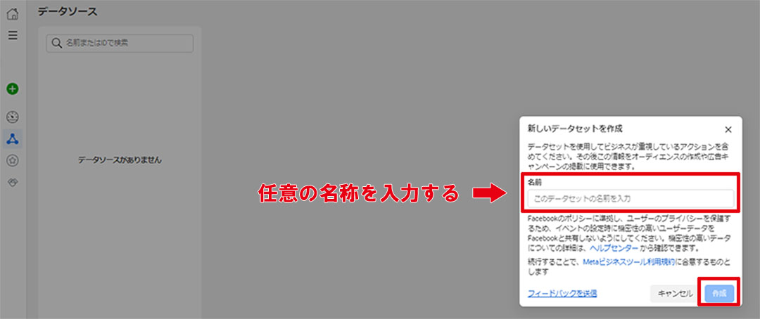 「確認」をクリックすると、イベントマネージャの「データソース」に「名前を付けたFacebookピクセル」が作成されます。