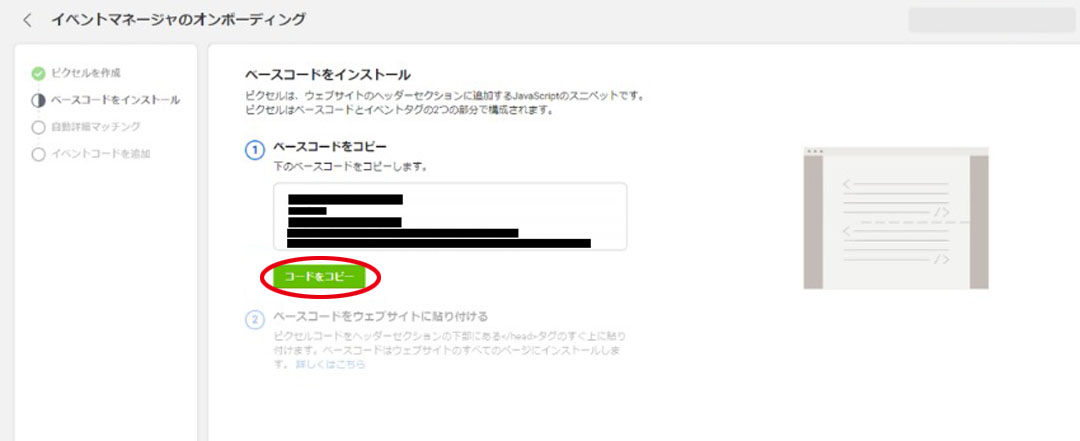 「イベントマネージャのオンボーディング」で「コードをコピー」をクリックして、自社webサイトのヘッダ内に設置しましょう。