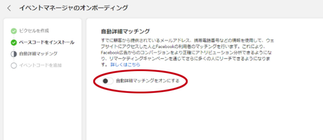 コードをコピーすると「自動詳細マッチングをオンにする」かどうかを切り替えるスイッチが出てくるので、特別な理由やこだわりがなければオンにしておきましょう。