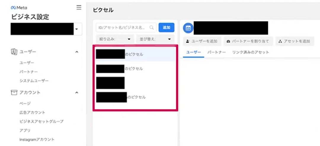 任意のピクセルを選択して、上の図の赤丸にある「Metaピクセルを設定」をクリックします。