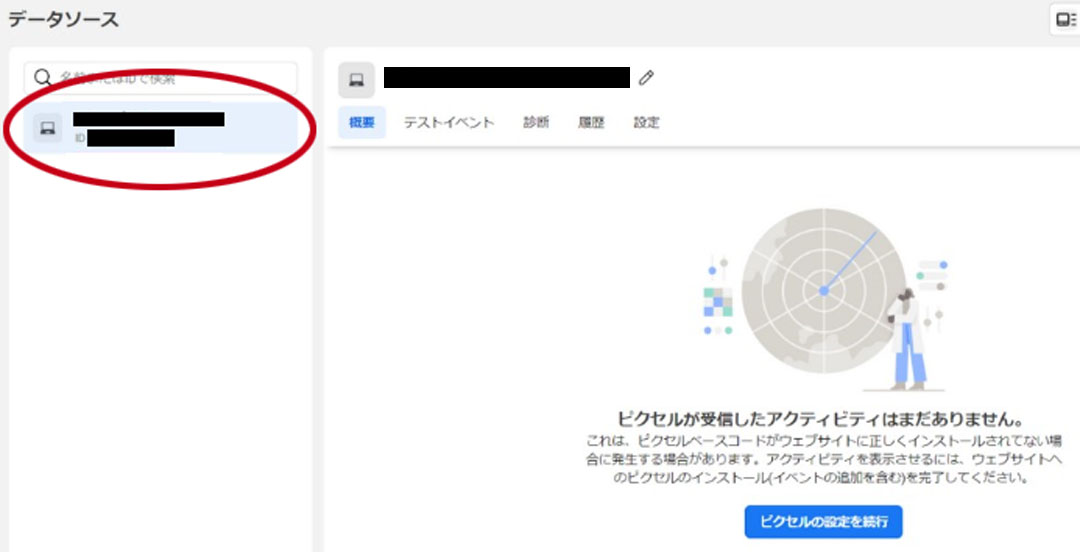 選択した後は、設置したIDと同じピクセルが画面左側に表示されていれば、設置したFacebookピクセルは問題なく動作しているということになります。