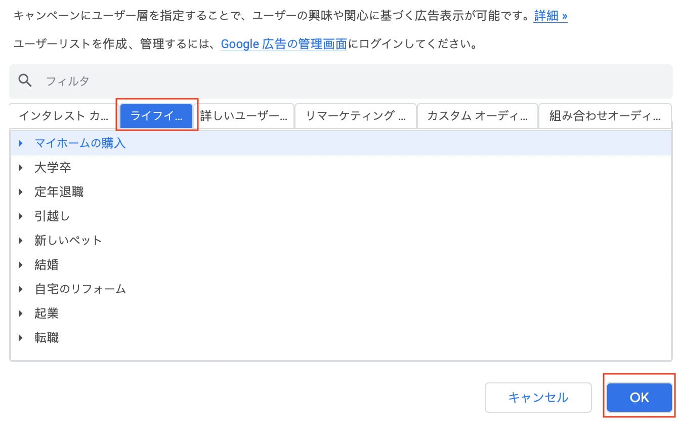 | ライフイベント | 人生の大きな節目を迎えているユーザーにリーチします。 | YouTube、Gmail、ディスプレイ広告 |