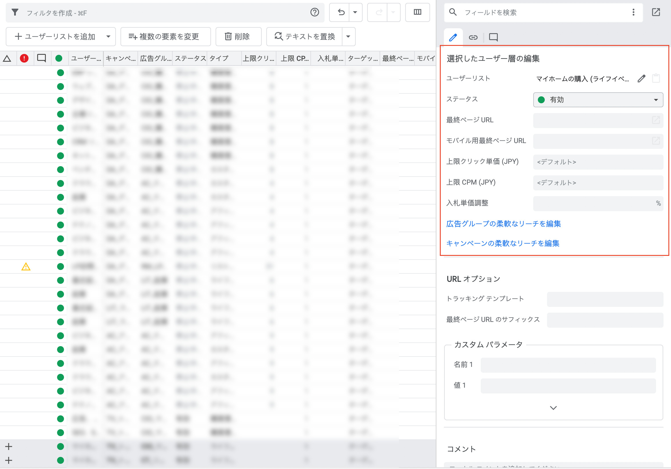 Google広告エディタを開き、左側にある「管理」のタイプリストで [キーワードとターゲット設定]、[ユーザーリスト] の順にクリックします。