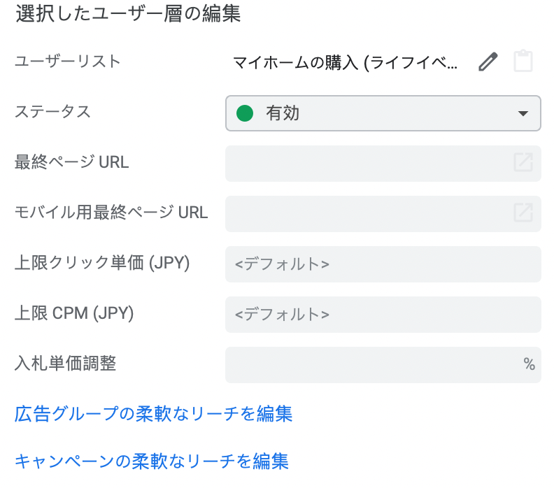 ここから先は、その他のディスプレイ広告の設定と同様です。ターゲットの拡張や入札単価、オーディエンスの設定をしてください。
