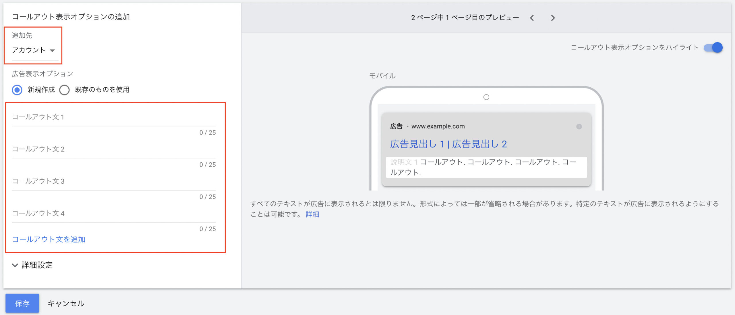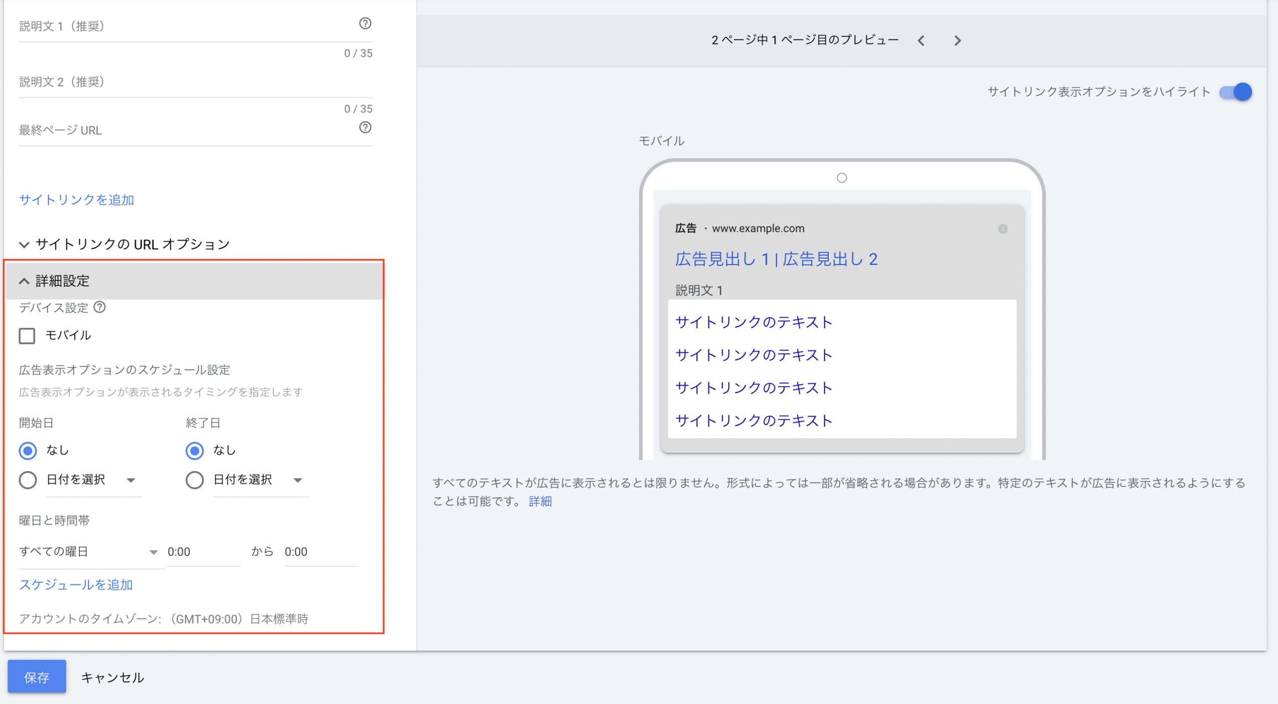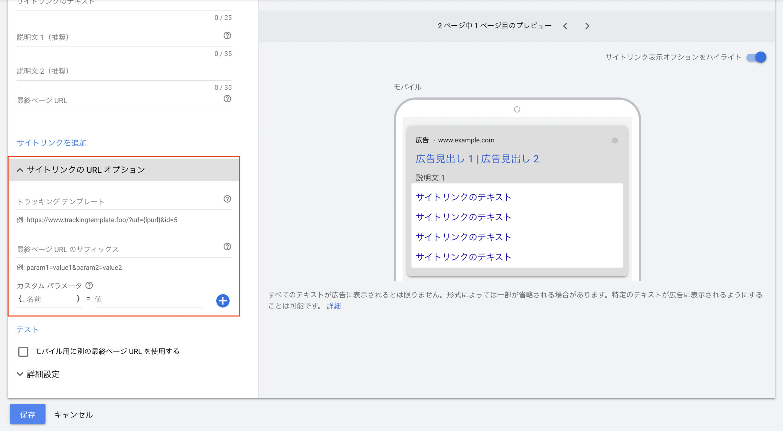 3.〔サイトリンクのURLオプション〕、〔詳細設定〕も必要に応じて入力 ※他の広告表示オプションでも使用されるので以下から省略 4.保存をクリックしたら完了