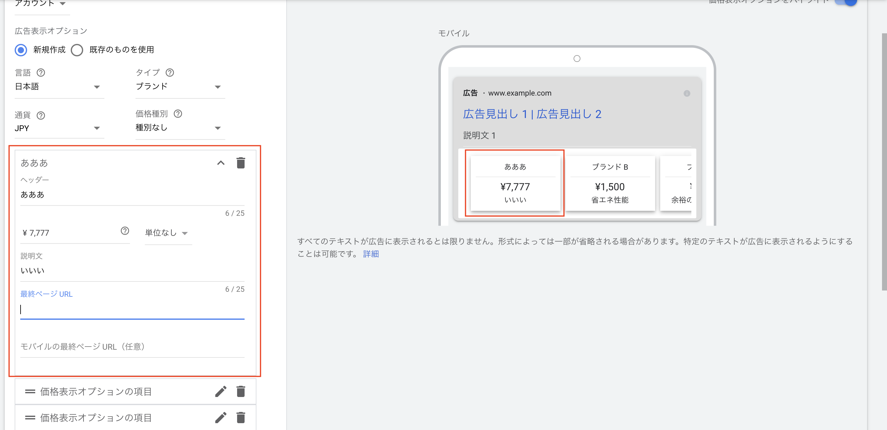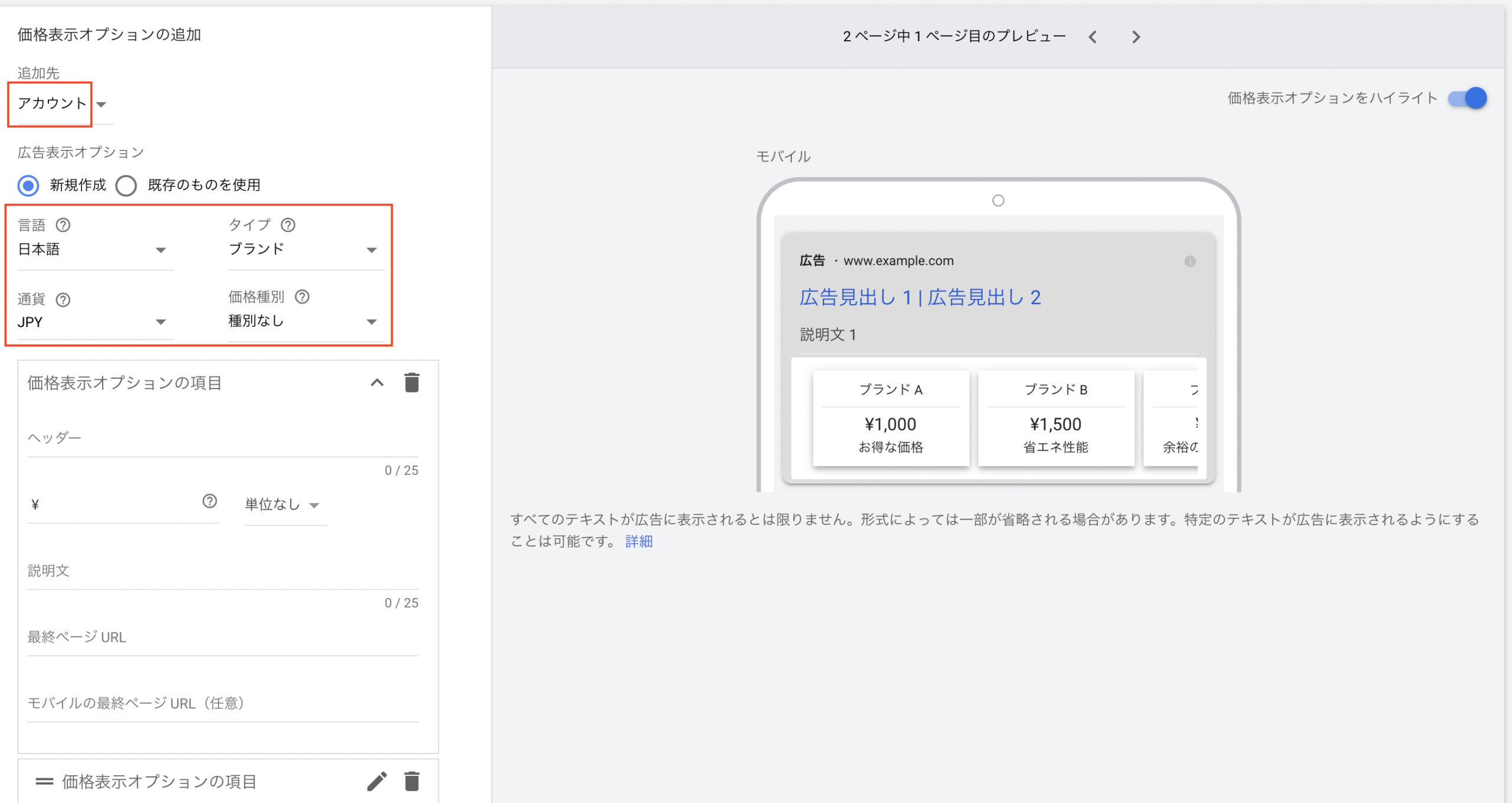 1.追加先を▼から選択し、広告に表示する言語、商品のタイプ、通過、価格種別を入力