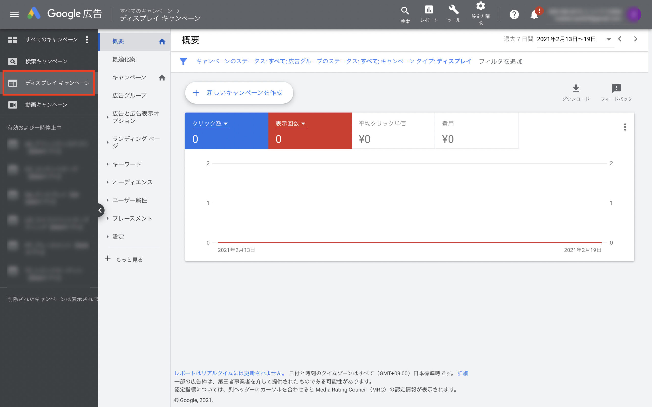まず、検索連動型広告の手順と同様にディスプレイキャンペーンをクリックし、「広告表示オプション」をクリックします。