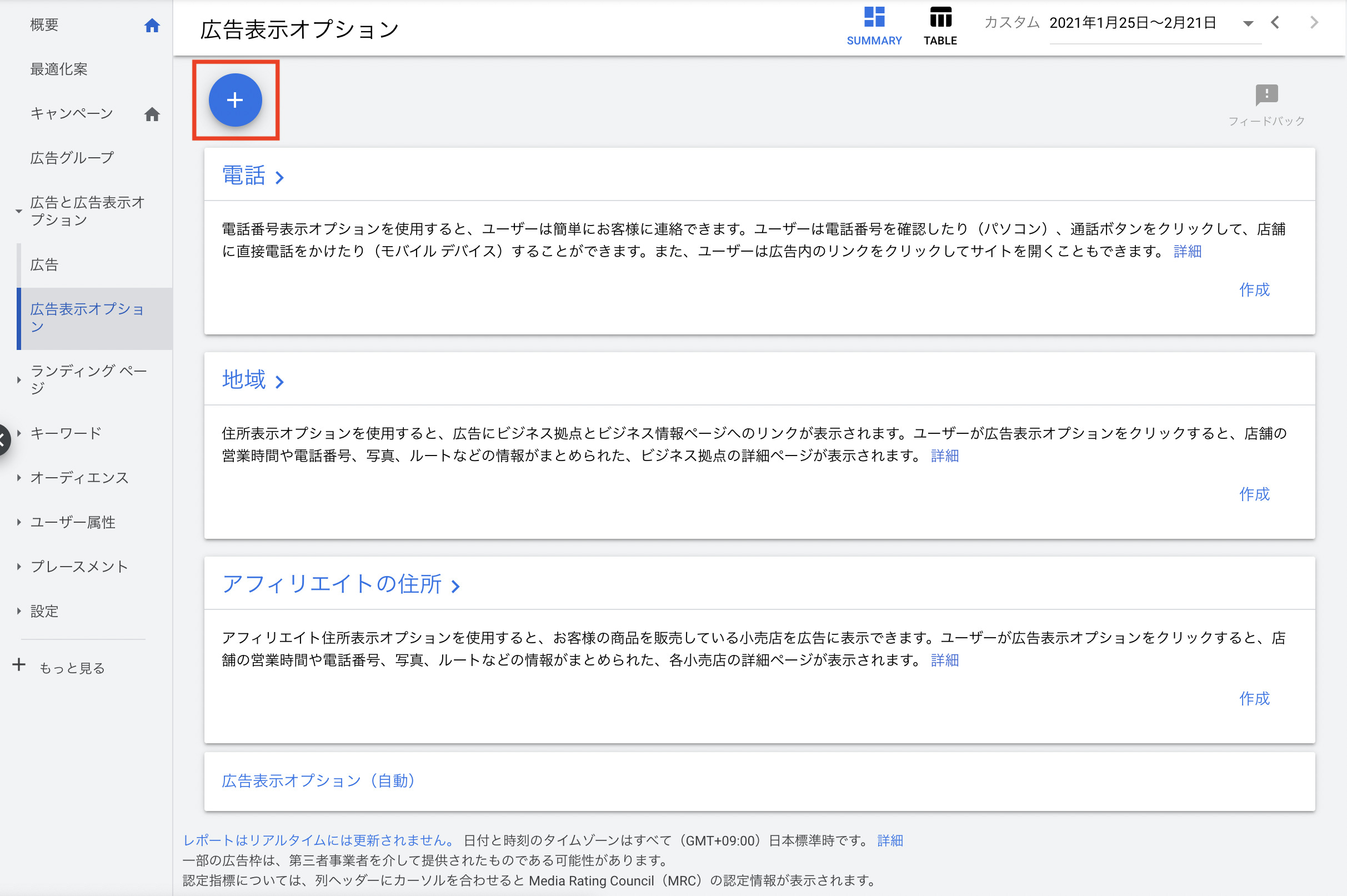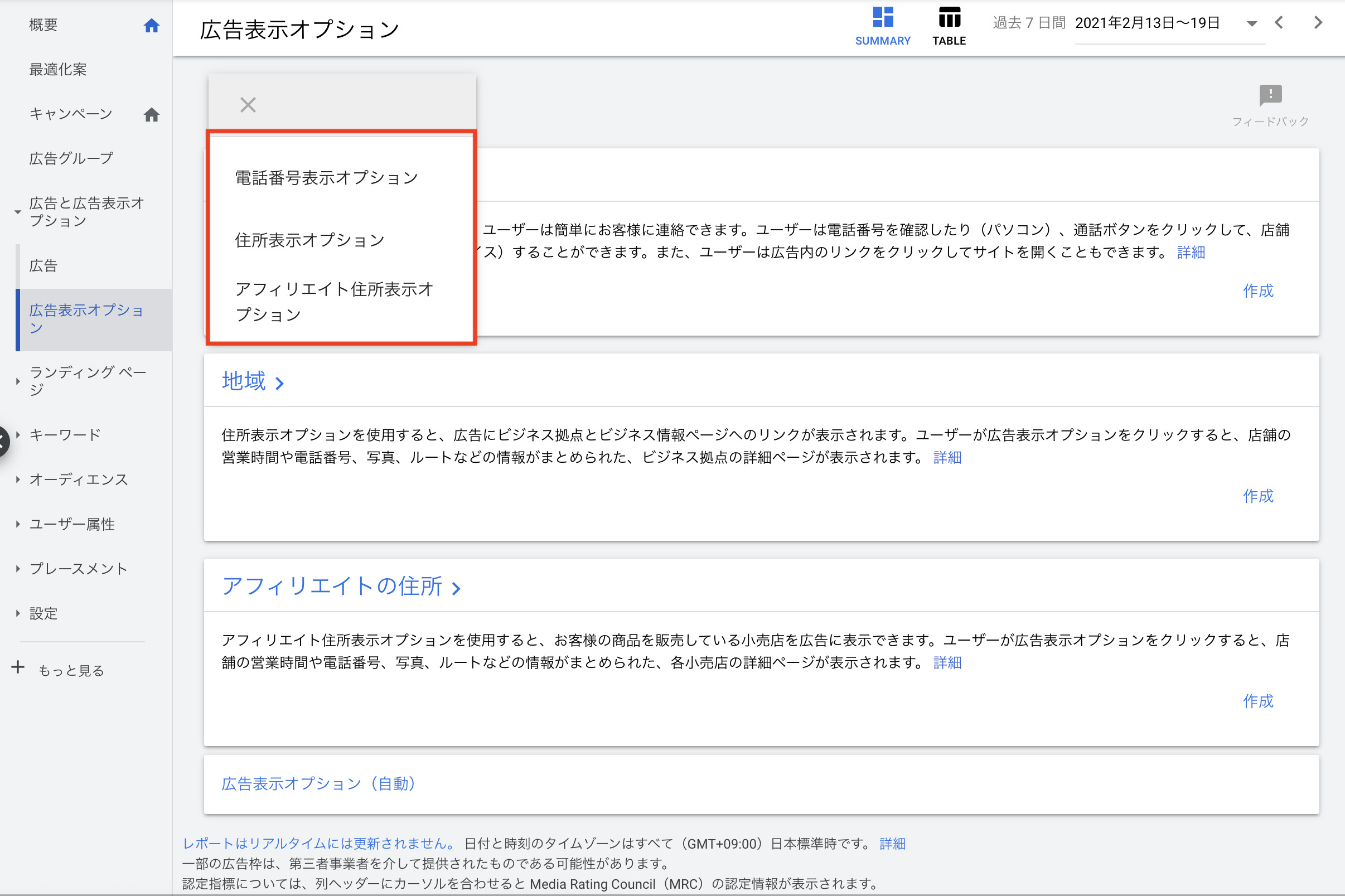 3種類あり、上記の検索連動型広告の表示オプションと同様の手順になります。