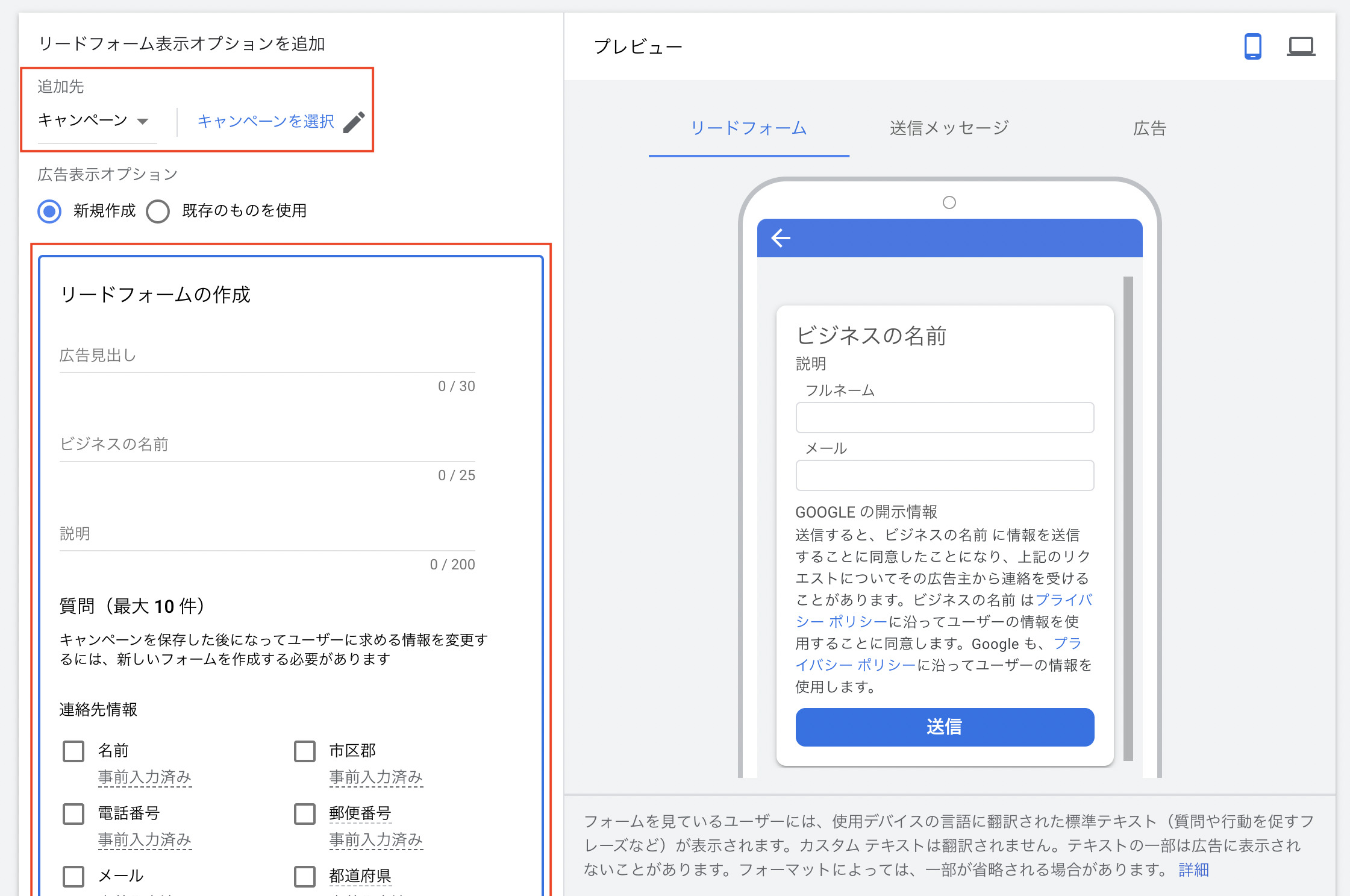 1.追加先をキャンペーンを選択から指定し、〔リードフォームの作成〕に必要事項を入力