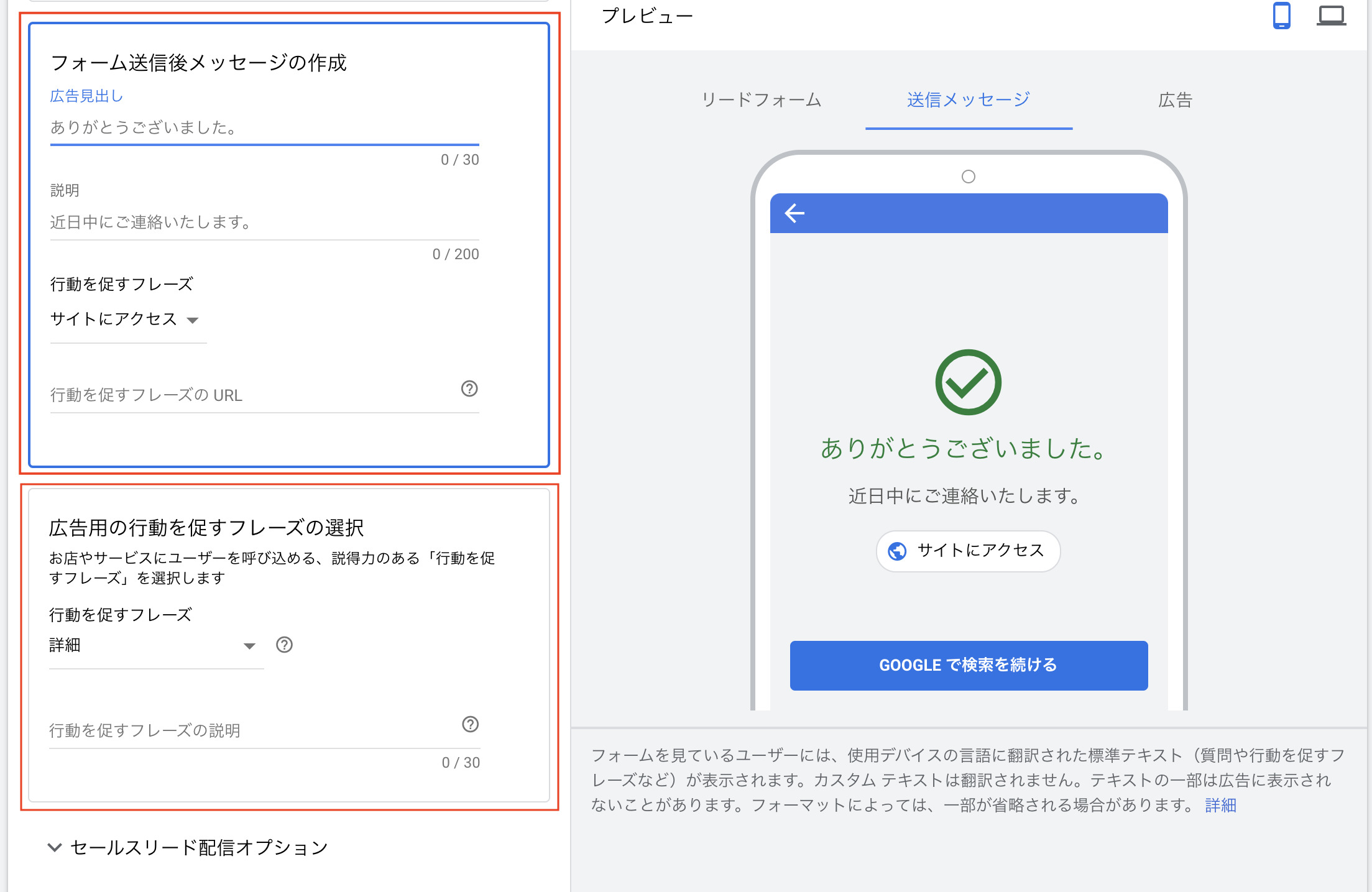 2.〔フォーム送信後メッセージ作成〕、〔広告用の行動を促すフレーズ〕も入力 3.保存をクリックしたら完了