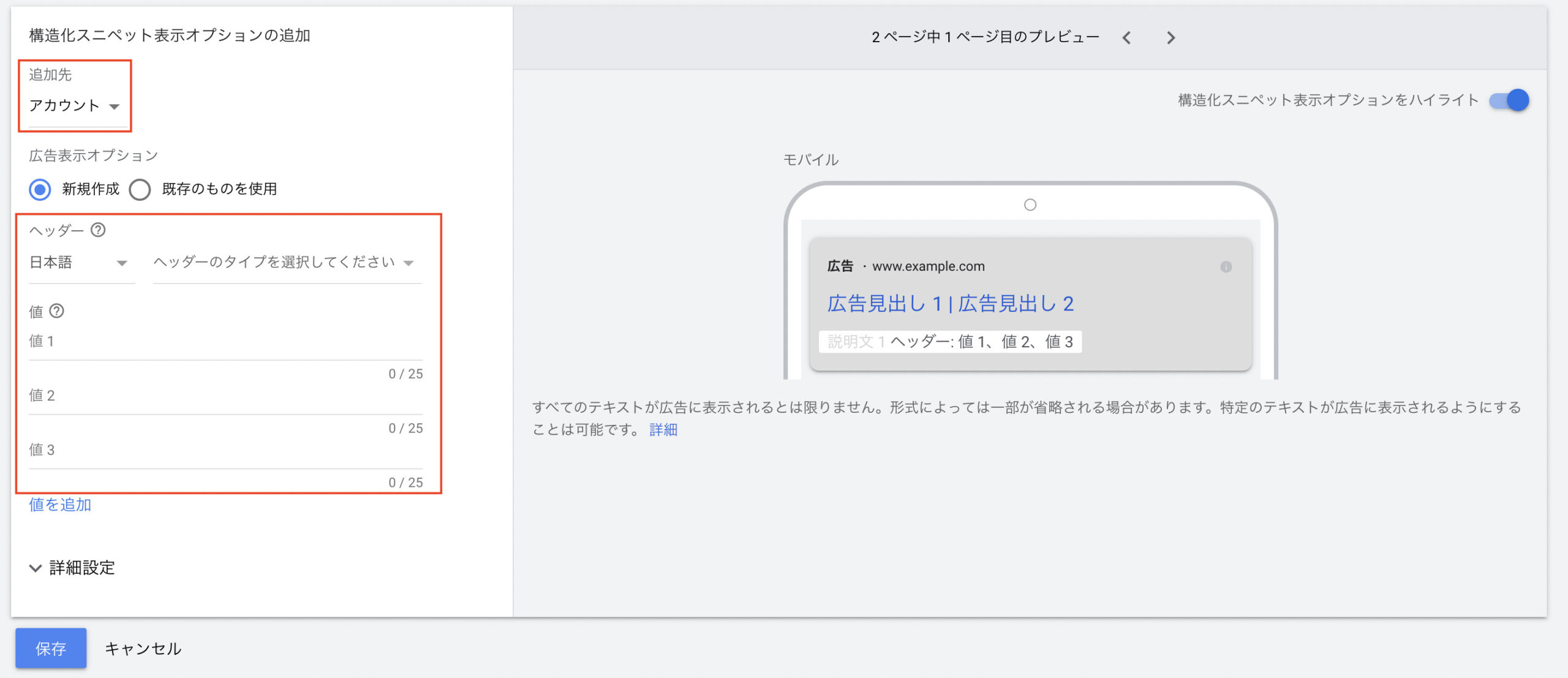 1.追加先を▼から選択し広告に表示するヘッダーと値を入力 2.保存をクリックしたら完了