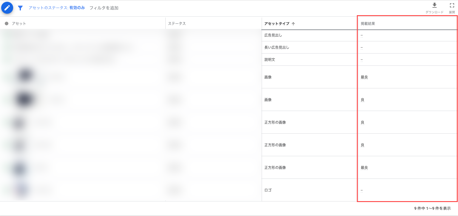 次に、より重要なのがアセット単位での評価です。各広告グループのアセット詳細画面では、それぞれの画像や見出しが「学習中」「低い」「良好」「最良」の4段階で評価されます。この評価は、同じ広告グループ内の他の同種アセットと比較した際の相対的なパフォーマンスを示しています。この評価を基に、以下の改善サイクルを定期的に(例えば2週間~1か月に1回)実行します。