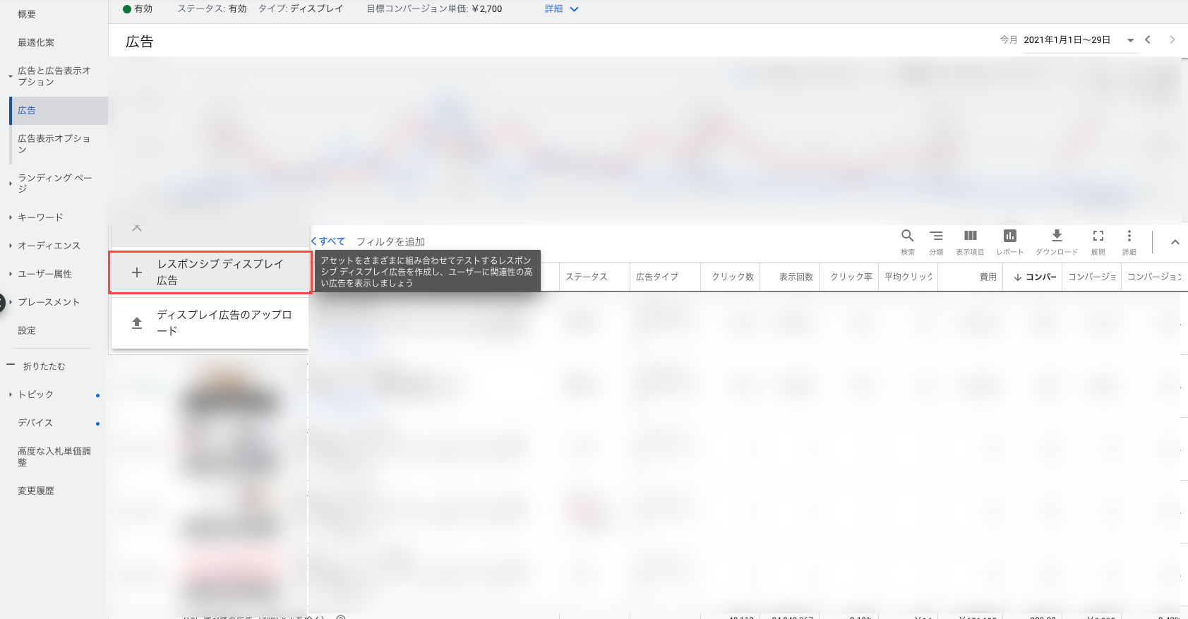 左側のメニューから「広告とアセット」をクリックし、その中の「広告」を選択します。青い「+」ボタンをクリックし、表示されるメニューから「レスポンシブ ディスプレイ広告」を選択します。