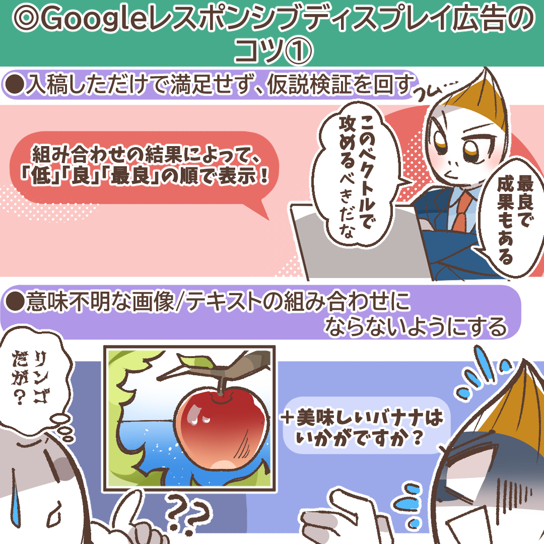 一方で、RDAはクリエイティブの組み合わせを完全にコントロールできないため、意図しないデザインの広告が生成される可能性がある点はデメリットとして認識しておく必要があります。
