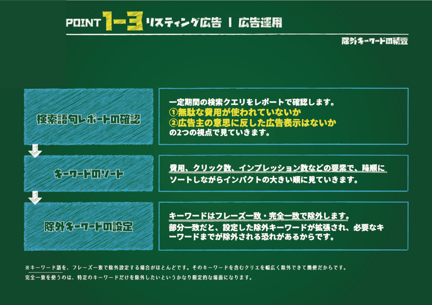 - 除外の実行: 候補となった語句について、ビジネスへの影響を最終判断した上で、適切なマッチタイプ(基本的にはフレーズ一致か完全一致を推奨)で除外設定を行います。