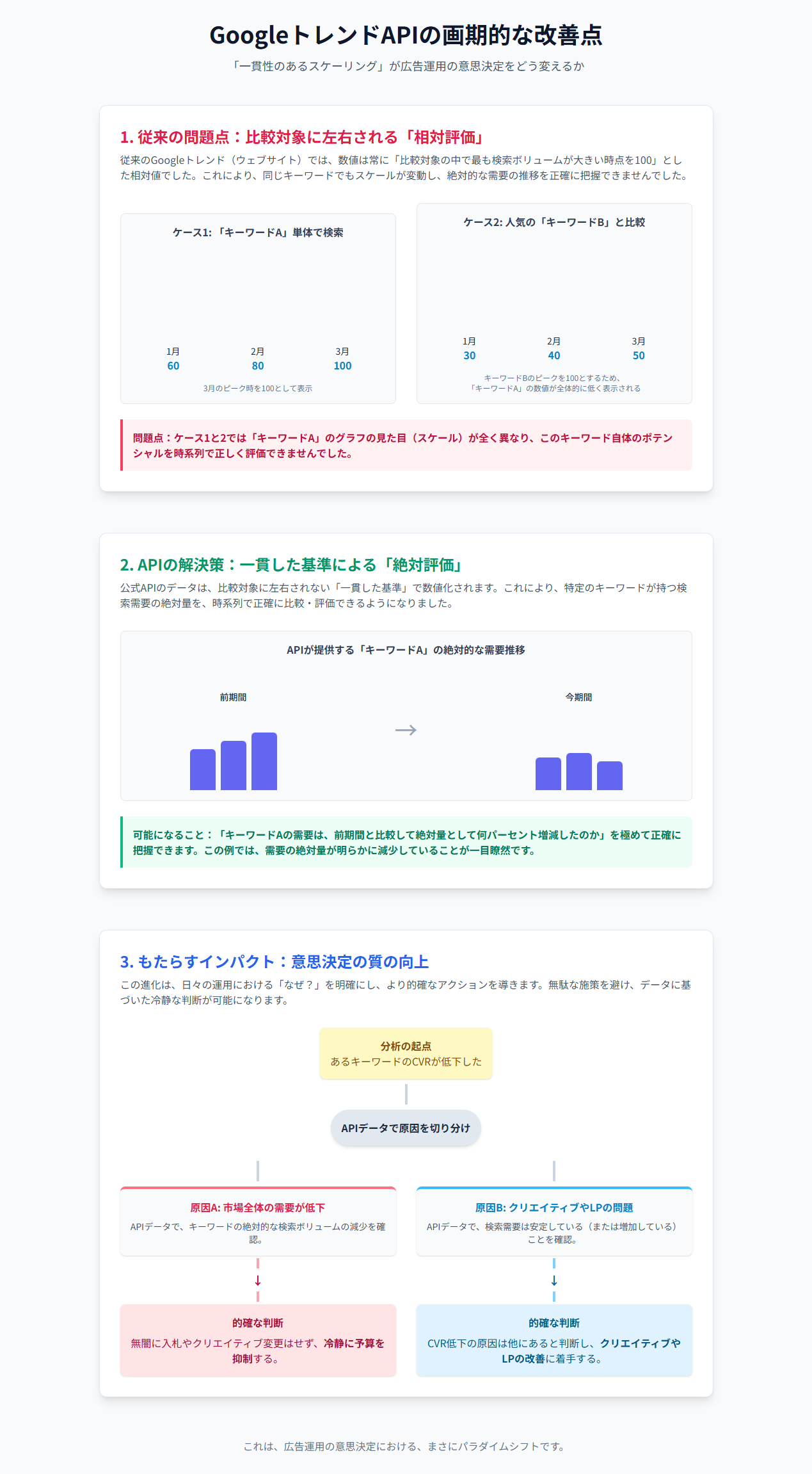 数ある機能の中でも、我々広告運用者が最も注目すべきは「一貫性のあるスケーリング(Consistent Scaling)」という仕様です。これは、従来のウェブUIが抱えていた根本的な課題を解決する、まさに画期的な改善点と言えます。従来のGoogleトレンドのウェブサイトでは、表示される数値は常に「比較対象の中で最も検索ボリュームの大きい時点を100とした相対値」でした。これは、複数のキーワードを比較する際には便利ですが、単一のキーワードの絶対的な需要の推移を正確に把握するには不向きでした。例えば、「キーワードA」単体で見た場合と、「キーワードA」と「キーワードB」を比較した場合とでは、「キーワードA」のグラフのスケール(縦軸の目盛り)が全く変わってしまうのです。これでは、特定のキーワードの持つポテンシャルそのものを時系列で正しく評価することは困難でした。しかし、公式APIが提供する「一貫性のあるスケーリング」によるデータは、このような比較対象によるスケールの変動がありません。つまり、各キーワードが持つ「検索インタレスト」を、一貫した基準で数値化してくれるのです。これにより、我々は「キーワードAの需要は、先月と比較して絶対量として何パーセント増減したのか」を、極めて正確に知ることができます。この進化がもたらすインパクトは計り知れません。例えば、あるキーワードのコンバージョン率(CVR)が低下した際、その原因が「クリエイティブやLPの問題」なのか、あるいは「市場全体の需要の絶対量が低下した」ことによるものなのかを、明確に切り分けることが可能になります。もし後者が原因であれば、CVRの低下を嘆いて無闇に入札を強化したり、クリエイティブを差し替えたりといった無駄なアクションを避け、冷静に予算を抑制するという的確な判断が下せるのです。これは、日々の運用における意思決定の質を根底から覆す、まさにパラダイムシフトなのです。