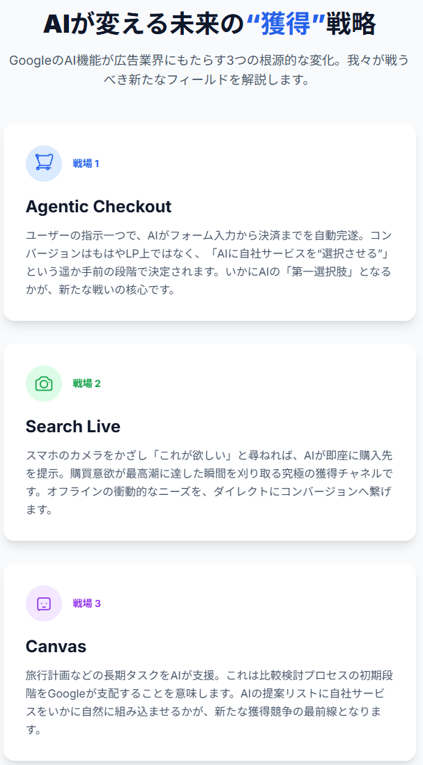 一見すると獲得から遠いように思えるのが、旅行の計画やレポート作成といった、ユーザーの長期的なタスクを支援する「Canvas」機能です。しかし、その本質を見誤ってはいけません。これは、ユーザーの「比較検討プロセスの初期段階」そのものを、GoogleのAIが支配することを意味します。例えば、ユーザーが「夏の北海道家族旅行」というCanvasを作成したとします。AIは、移動手段、宿泊施設、アクティビティといった項目を自動で整理し、具体的な選択肢を提示し始めます。この時、AIが推奨するレンタカー会社、ホテル、観光ツアーとして、いかにして自社のサービスを自然に組み込ませるか。これが、新たな獲得競争の最前線となるのです。もはや、顕在層にキーワード広告を当てるのではなく、潜在層が「計画」という名の刈り取りリストを作成するそのプロセスに介入し、第一想起ならぬ「第一提案」を勝ち取ることが至上命題となります。