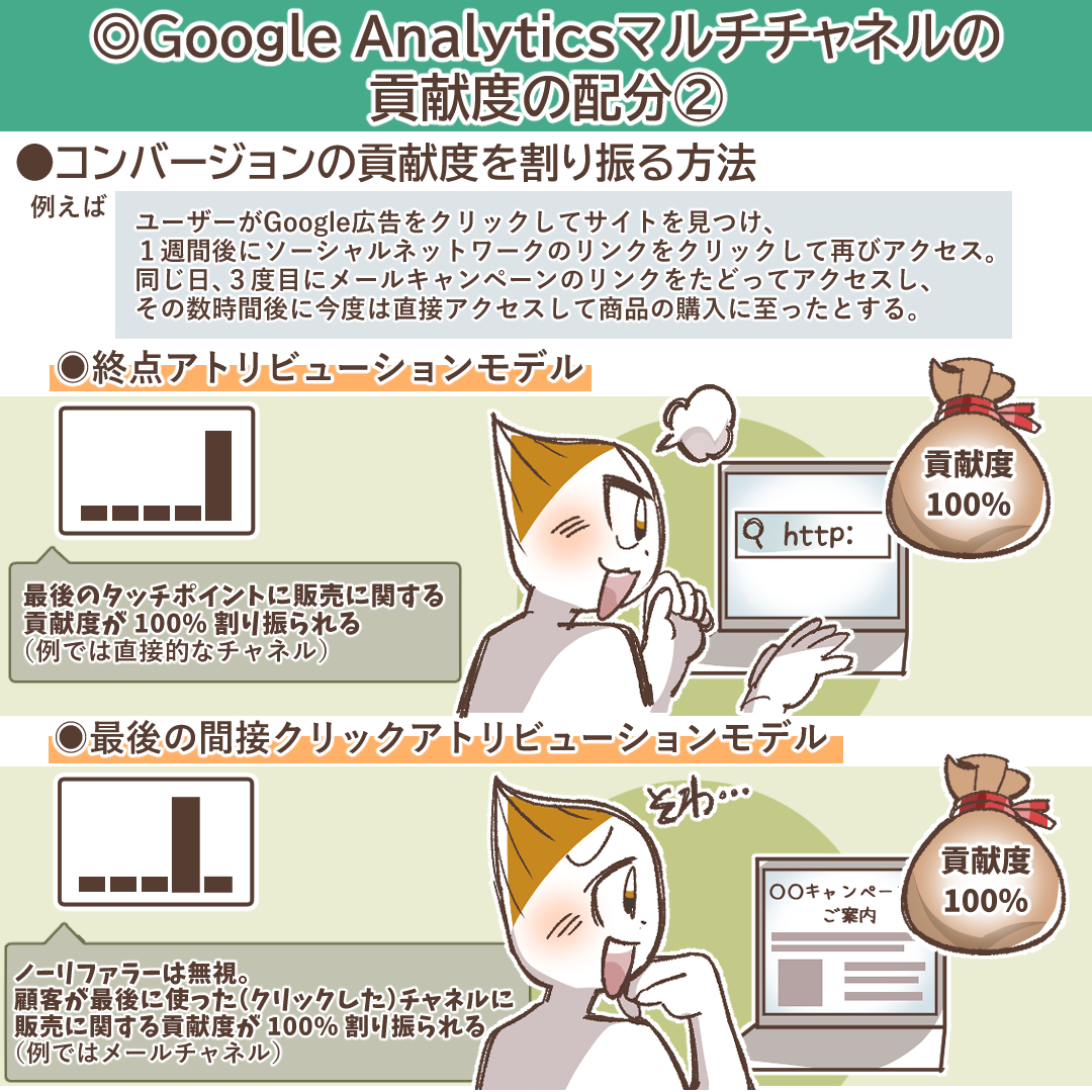 • ラストクリック(Cross-channel last click):コンバージョン経路上の最後のタッチポイント(チャネル)に貢献度の100%を割り当てます。シンプルで分かりやすいですが、それ以前の貢献を全て無視するため、現代のマーケティング評価には不十分とされることが多いモデルです。