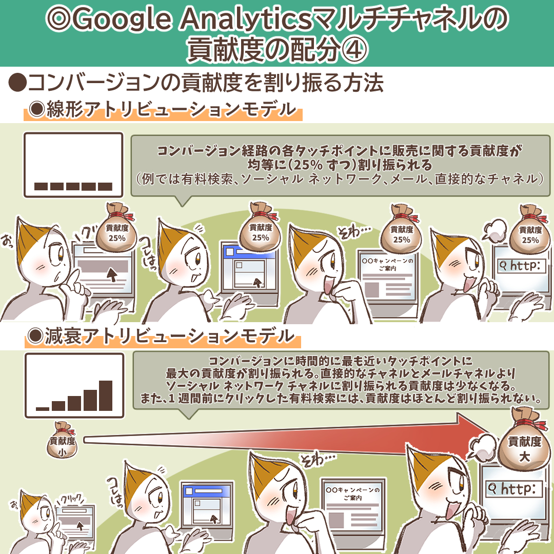 • 減衰(Cross-channel time decay):コンバージョンに近いタッチポイントほど貢献度を高く評価します。コンバージョン直前の行動をより重視したい場合に適しています。