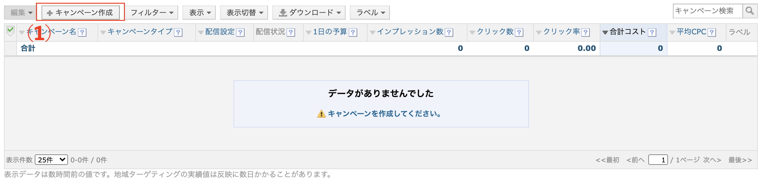 (1)検索広告タブのキャンペーン管理の中のキャンペーン作成をクリックします。