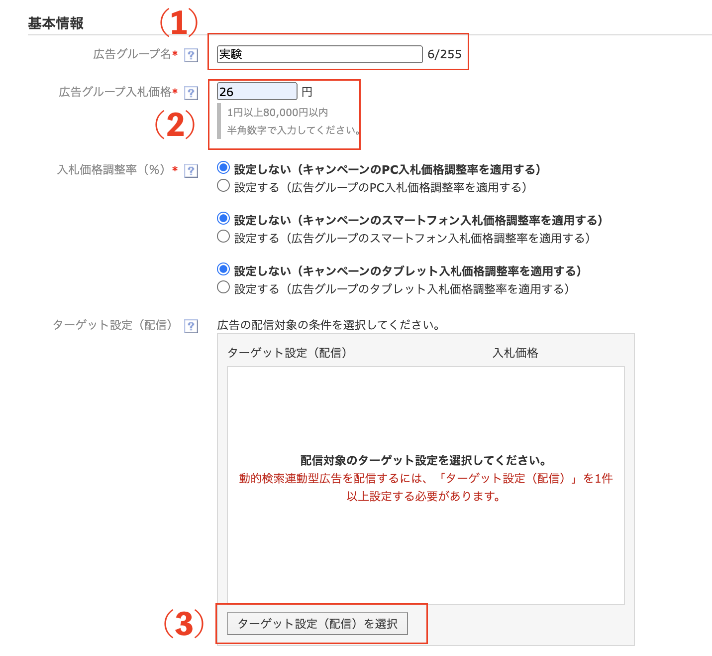 広告を設定していきます。広告名や説明文などを追加して、各項目を設定します。