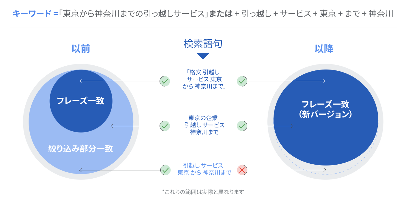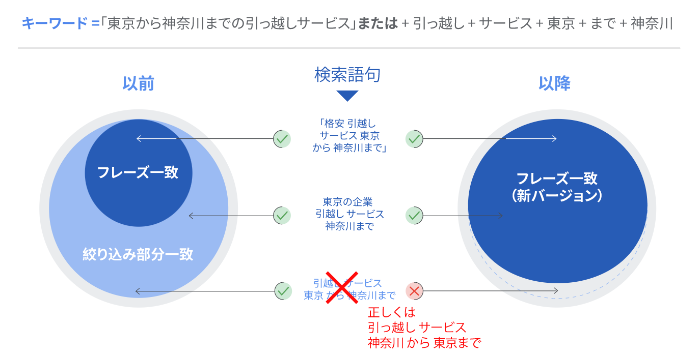 例をあげるとすると、「+引っ越し 都内」といったように「引っ越し」のみ絞り込み、「都内」を部分一致で広げていた場合、「都内」部分も今後はフレーズ一致として認識されるように変更になりました。