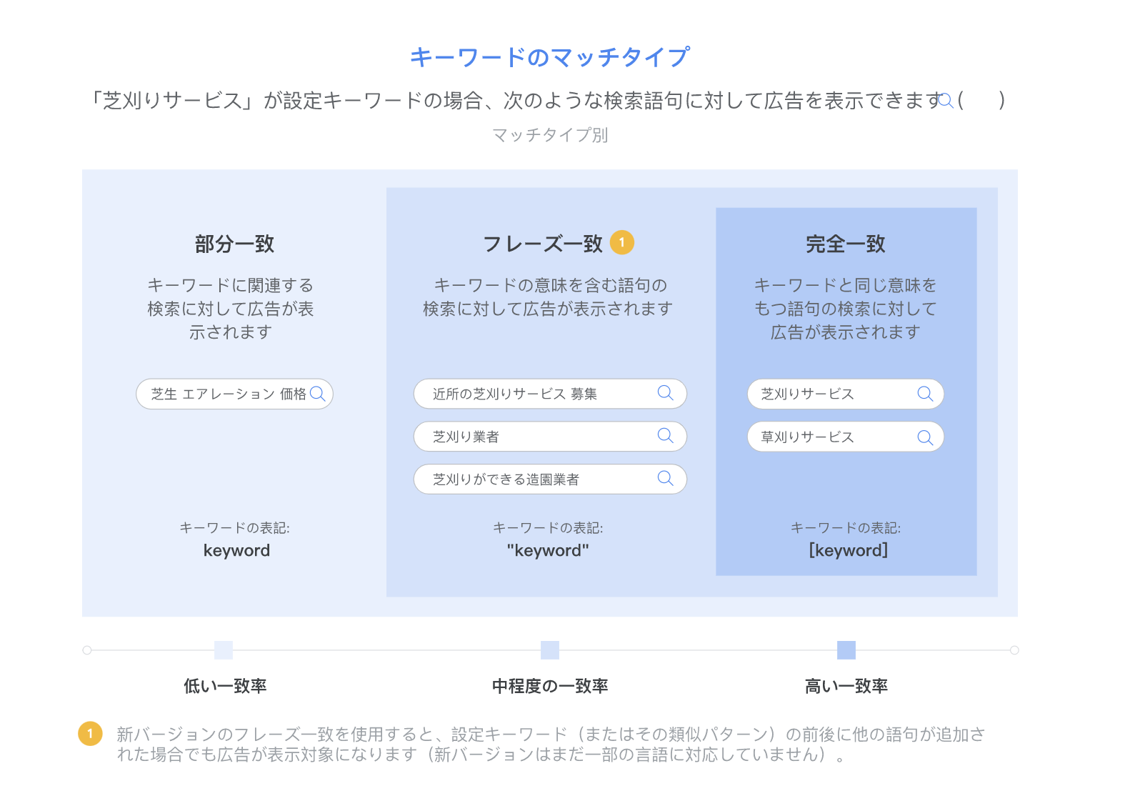 そのため、今後マッチタイプは部分一致、フレーズ一致、完全一致の3種類となります。