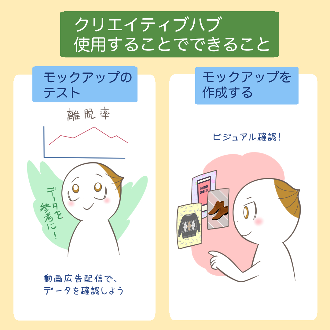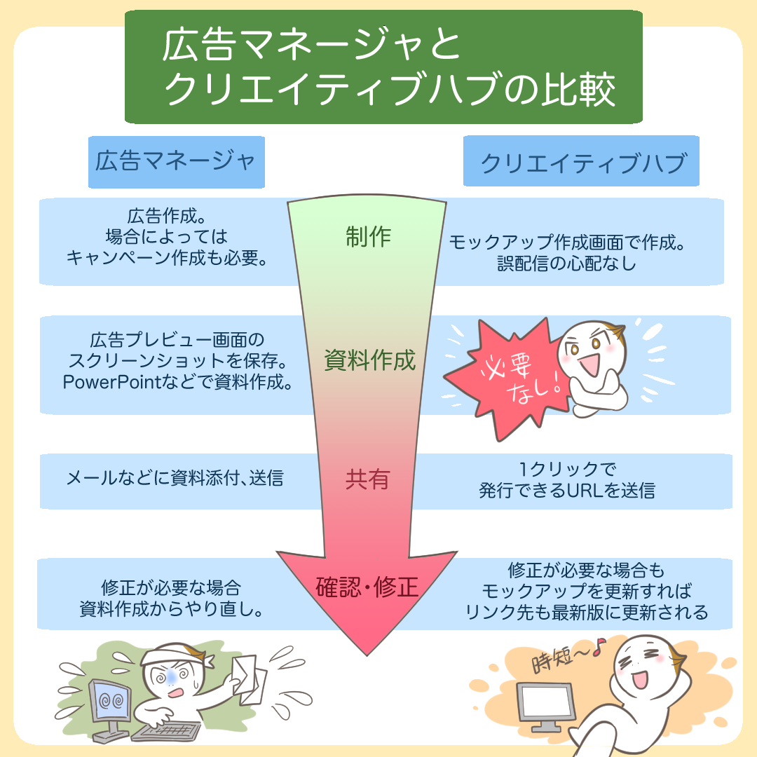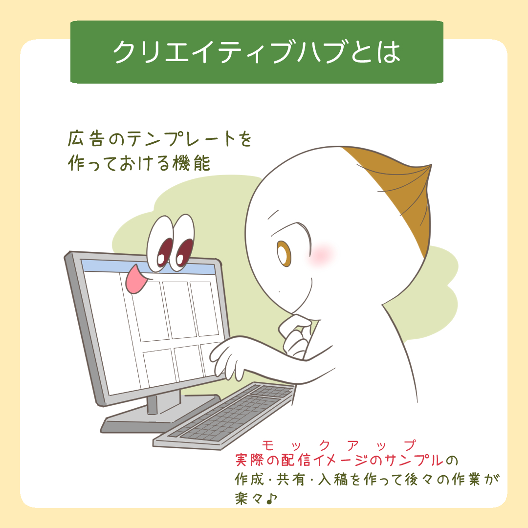 クリエイティブハブとは、クリエティブを、広告を実際に入稿して、停止して共有...という手段を踏まずとも、クリエイティブハブで下書き的に入稿、URLを共有、というて手順でクリエイティブの共有をすることのできるツールです。