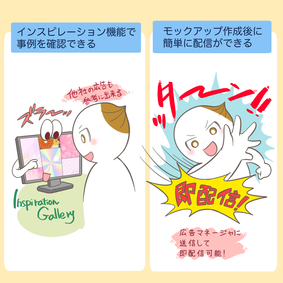 モックアップ(実際の配信イメージのサンプル)の作成・共有・入稿の機能があり、自社のクリエイティブのモックアップの作成・入稿をすることができる機能です。