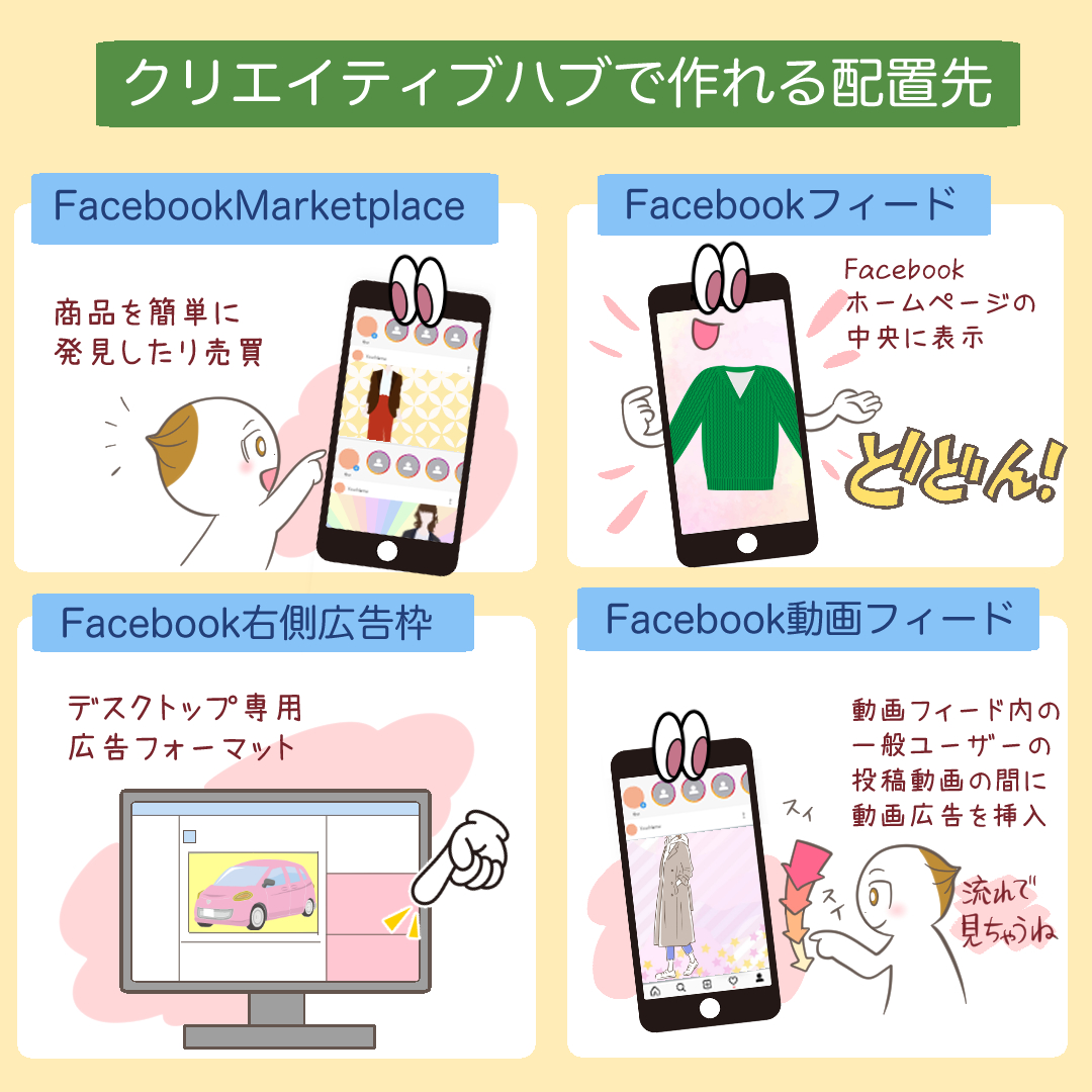 クリエイティブハブを使用することで、広告のアイデアをイメージ形にすることができイメージが掴みやすくなります。ここでは作成方法や共有の仕方、広告マネージャを使用した入稿方法などを説明していきます。