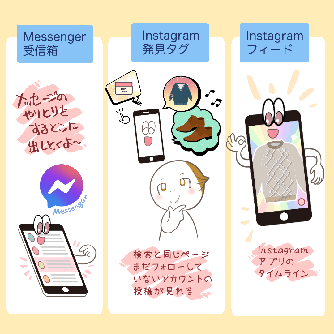 Messenger受信箱は、FacebookやInstagramの他の利用者からのプライベートメッセージとグループメッセージを受信する場所です。