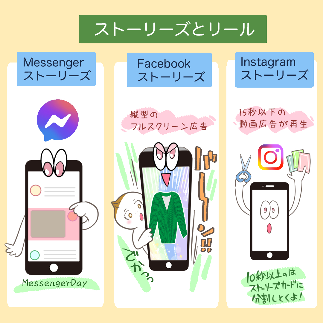 Instagramストーリーズでは、長さが15秒以下の動画広告が再生されます。10秒以上の動画広告は、複数のストーリーズカードに分割されます。