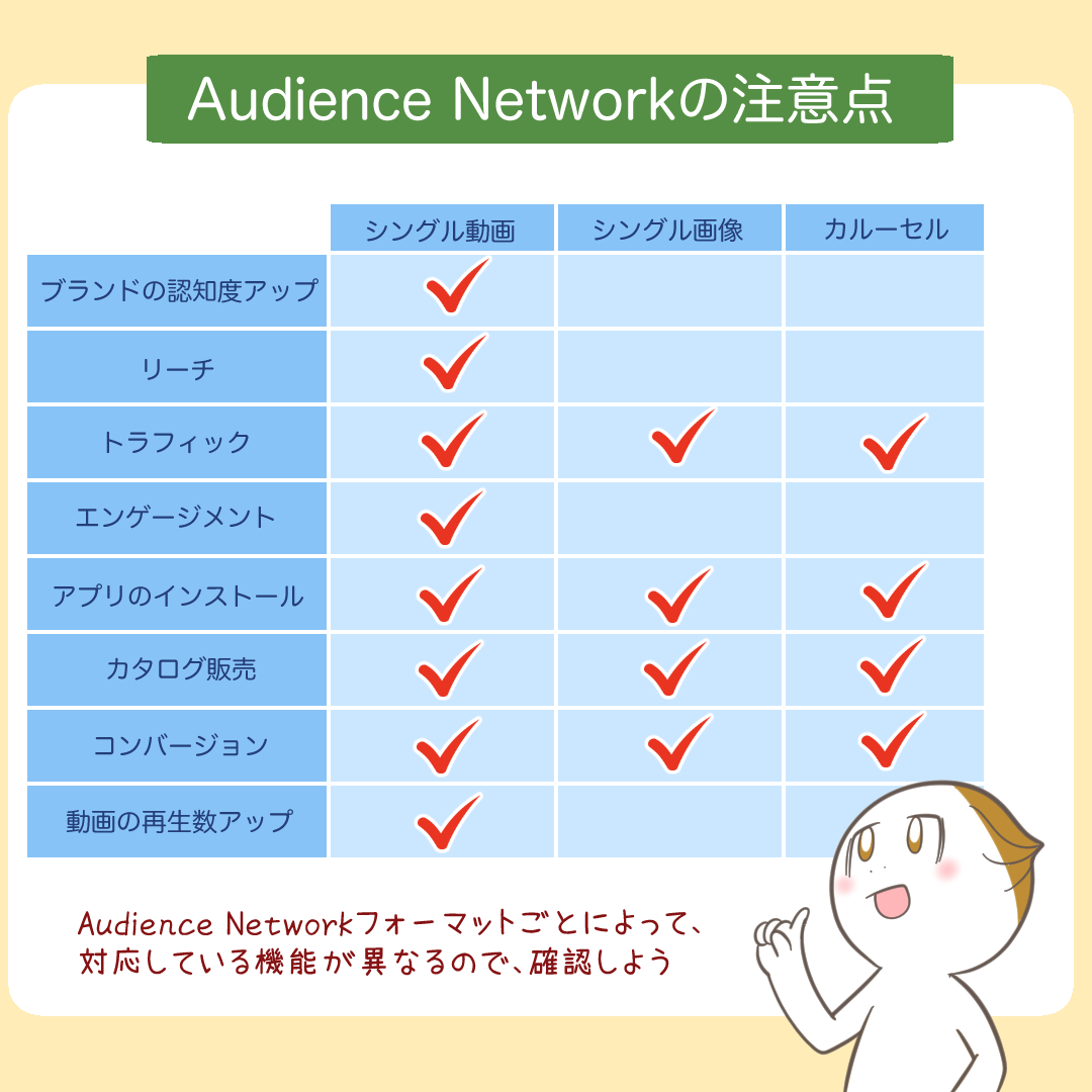 以下の表は、どのフォーマットがAudience Networkのどの目的で機能するかをFacebook社がまとめたものになります。
